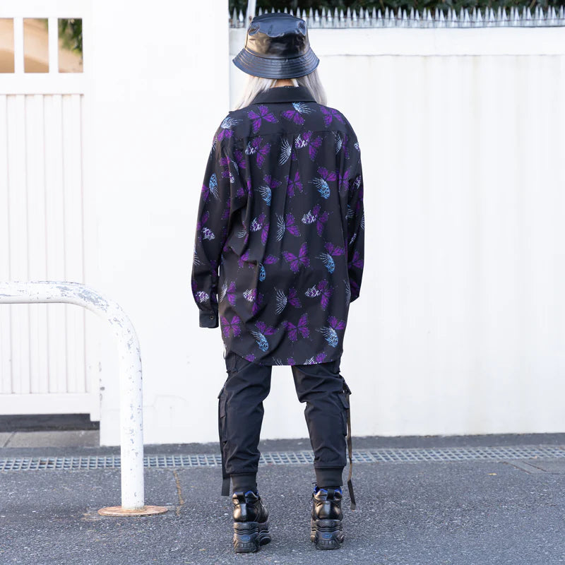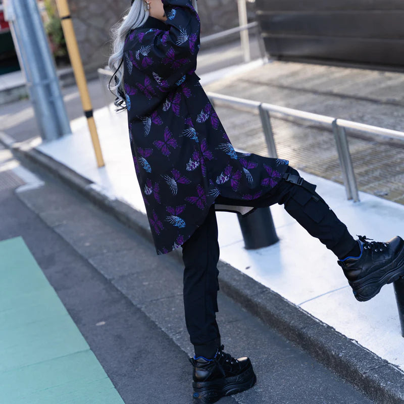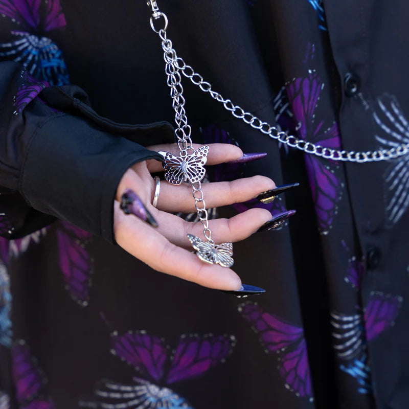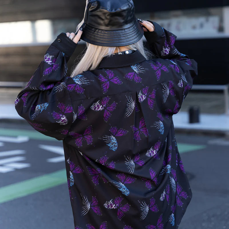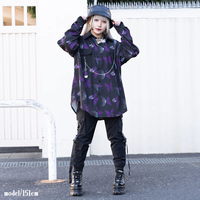 Expanding dark world with a half-bone immortal butterfly concept! New colors in the classic Yami Kawaii strawberry pattern. Long sleeve shirt with Yami Kawaii butterflies design and butterfly chain on the chest as an special accent.